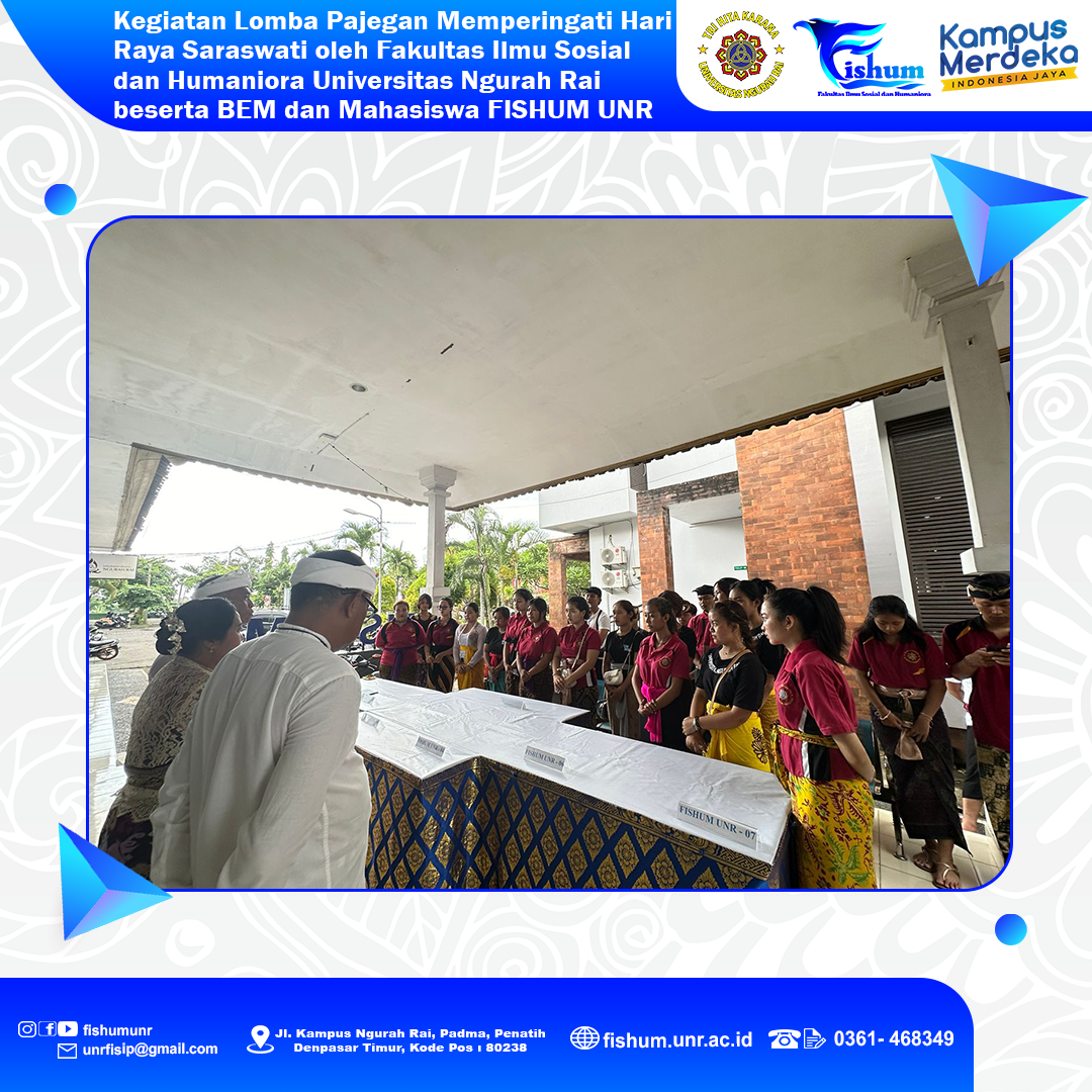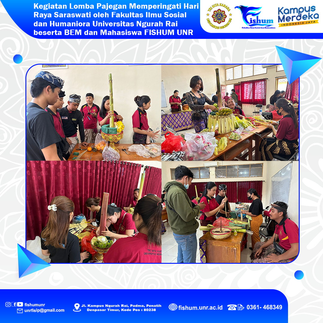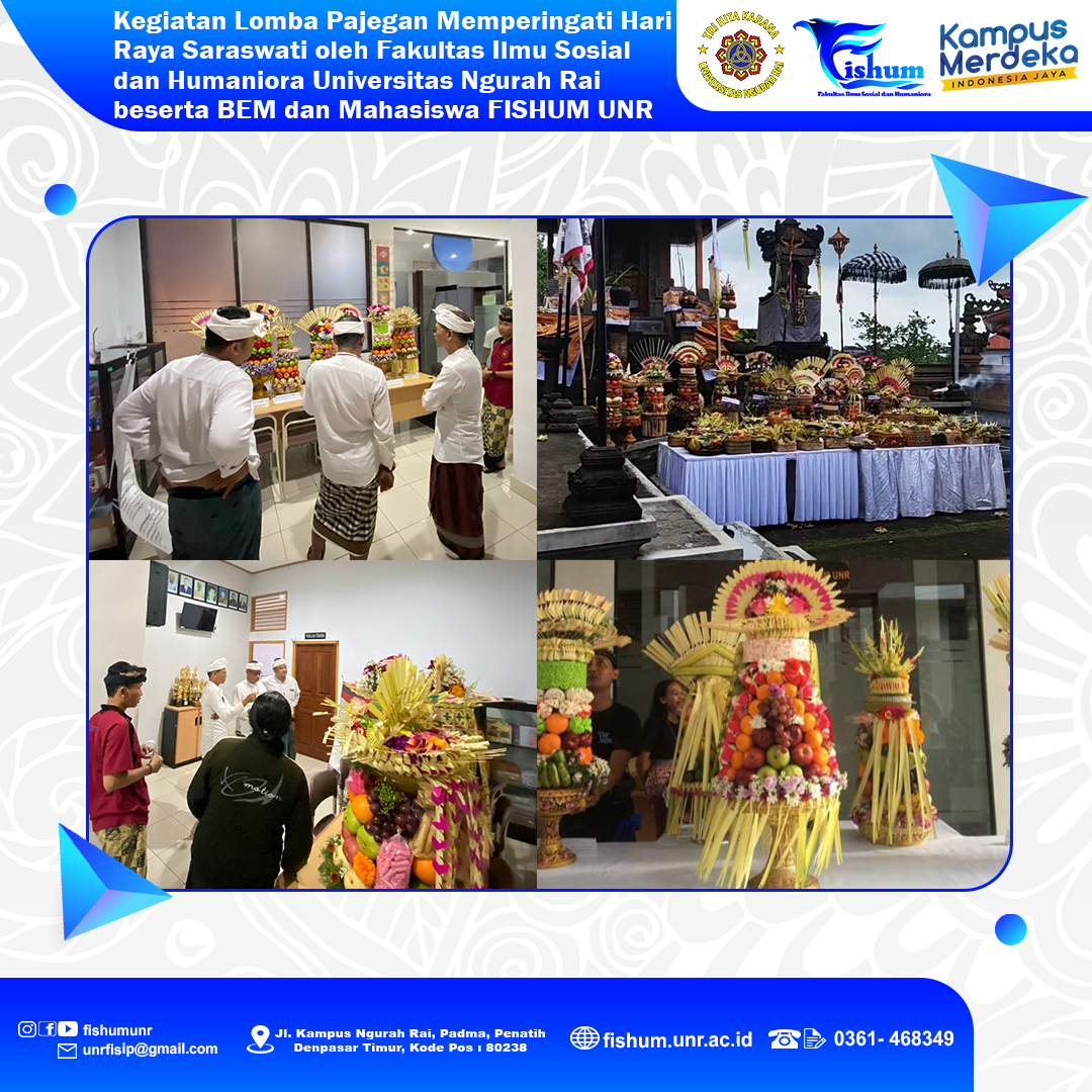 Telah dilaksanakan kegiatan Lomba Pajegan menyambut Hari Raya Saraswati oleh Fakultas Ilmu Sosial dan Humaniora Universitas Ngurah Rai beserta BEM dan Mahasiswa FISHUM UNR pada tanggal 15-16 Desember 2023