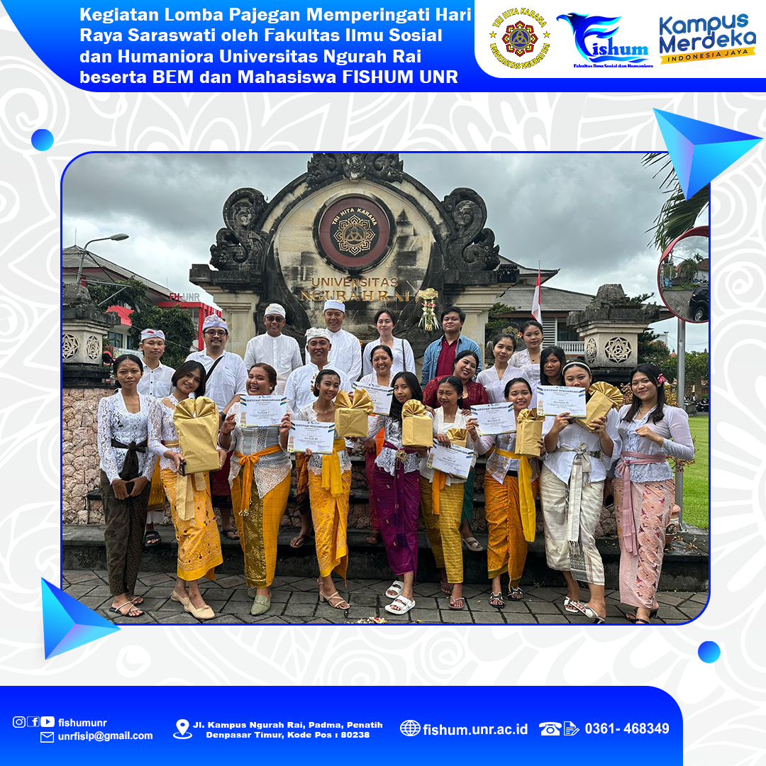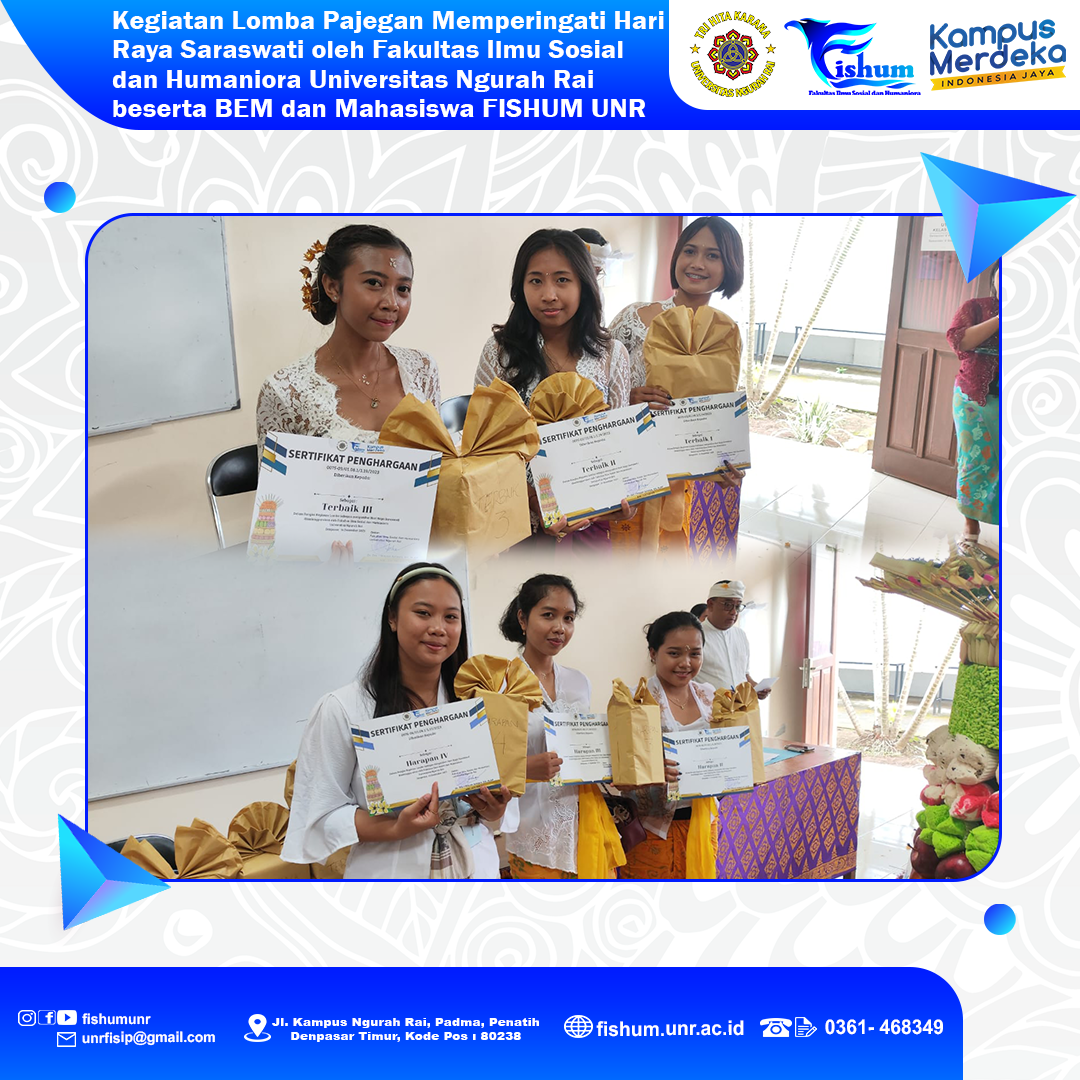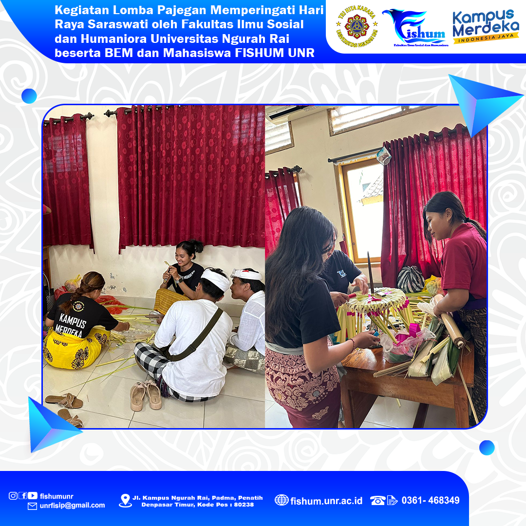 Telah dilaksanakan kegiatan Lomba Pajegan menyambut Hari Raya Saraswati oleh Fakultas Ilmu Sosial dan Humaniora Universitas Ngurah Rai beserta BEM dan Mahasiswa FISHUM UNR pada tanggal 15-16 Desember 2023